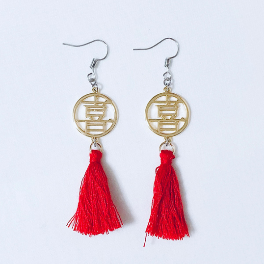 ゴールドの漢字モチーフと揺れる真っ赤なタッセルの相性がよいピアスです。
