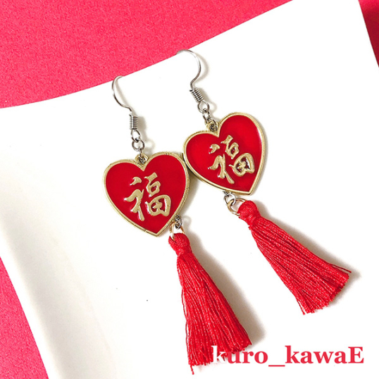 【即納】kuro_kawaE / チャイナモチーフピアス-福(301785)