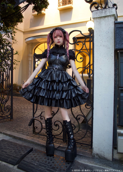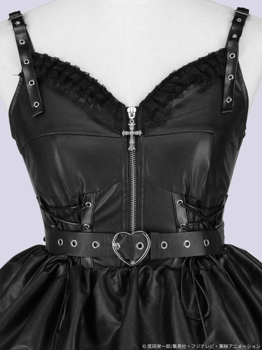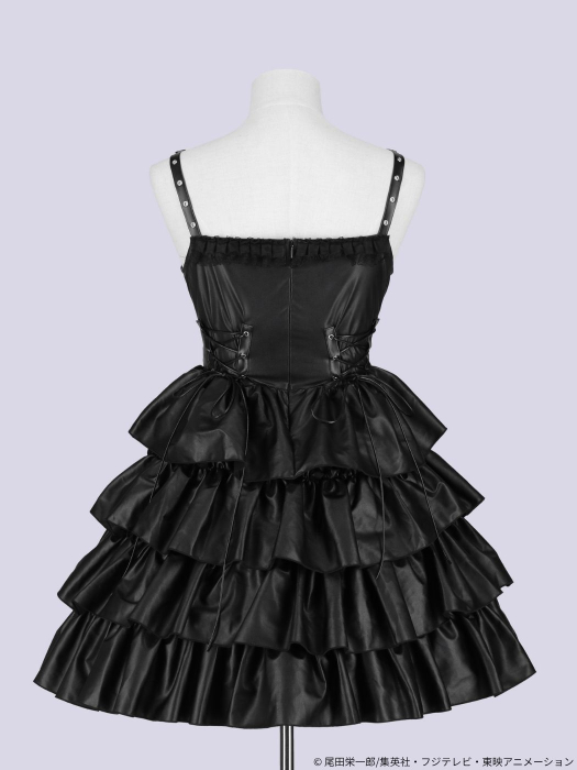 作中ペローナ着用ワンピースをオマージュした、4段フリルがゴージャスなレザーワンピースが登場。
