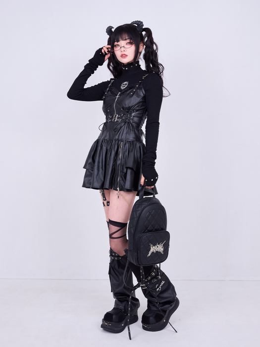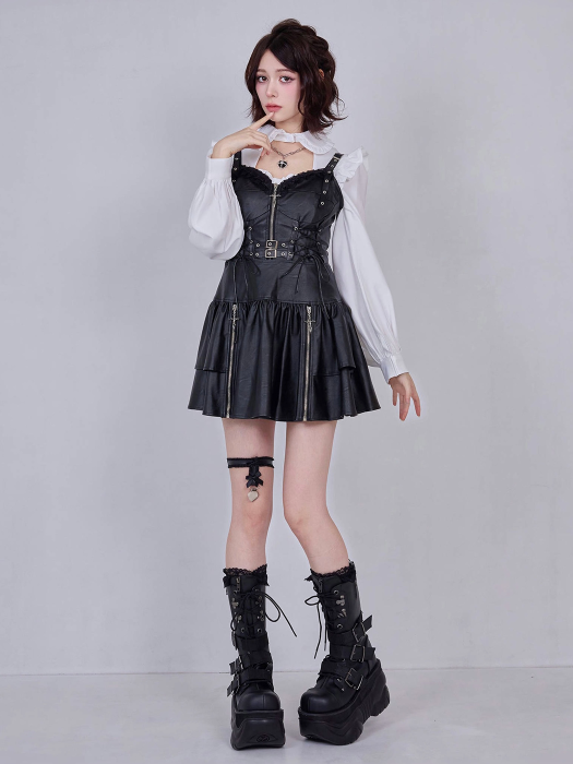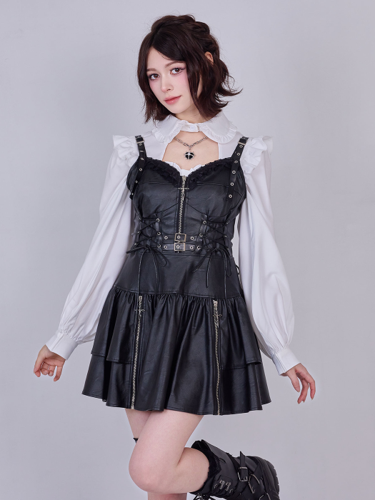 ハードなレザーにたっぷりのフリルを組み合わせた、IMVALのレザードレス。
