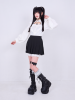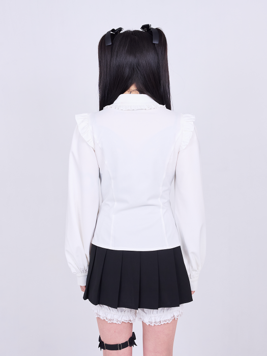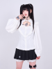 フロントにはハート型フリルが存在感抜群のの一着。ボディラインにフィットするシルエットに胸元のハート型フリルが存在感を放ちます。ボリュームスリーブやフリル襟も相まって、ゴシック・ヴィラン系の着こなしにもバッチリ。レザー、コルセット、ハーネスとの相性も抜群です。素材はさらりとしたポリエステル混です。