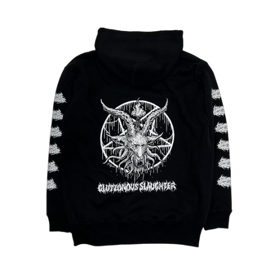 フロントはBDCのロゴ刺繍をさりげなく施し、バックデザインは人気のブルータルなBaphometをプリント!袖にはGluttonous Slaughterのロゴを。