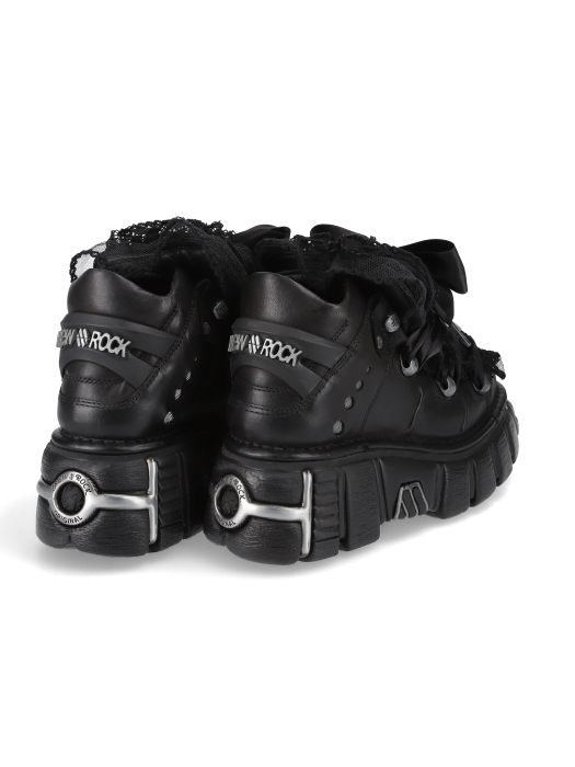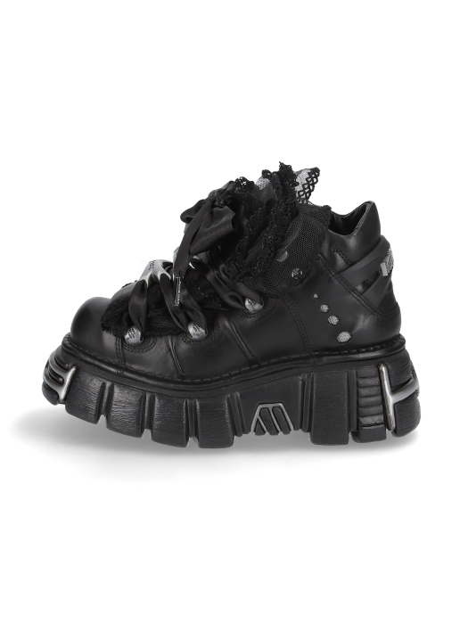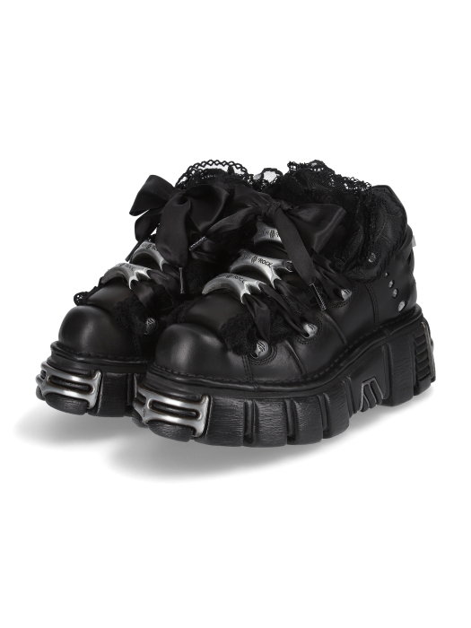 ハードな存在感に可愛さを兼ね備えたQOOZAとNEW ROCKによるスペシャルコラボモデル。アイコニックな重厚ソールとメタルパーツをベースに、アッパーには2層構造のブラックレースを贅沢に使用。靴紐にはサテンリボンを採用し、ゴシック、ロリータ、パンク、地雷系ファッションにもマッチするダークなムードを演出します。