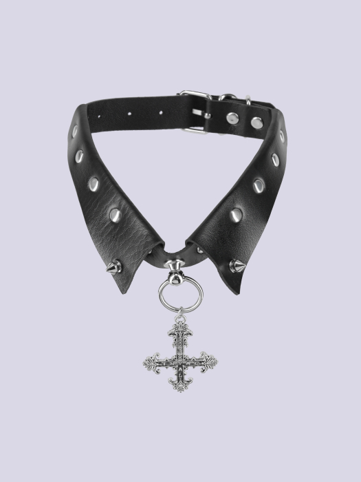 チョーカーにはIMVALオリジナルの逆十字チャームが揺れ、退廃と挑発のニュアンスをプラス。