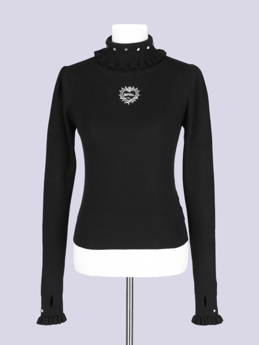 シンプルなブラックニットに、IMVALらしいスタッズとフリルを加えたハイネックトップ。