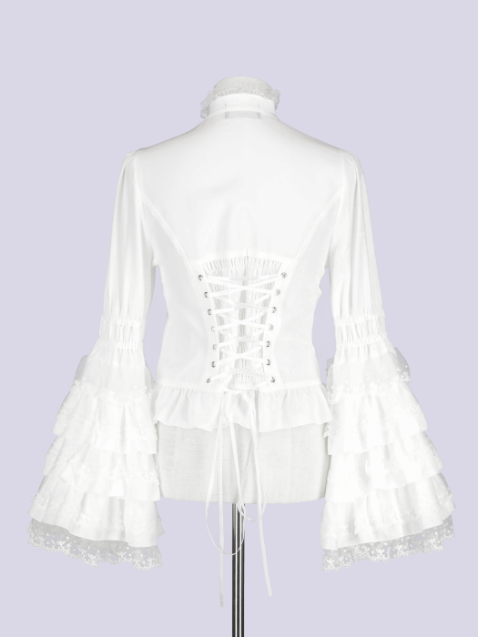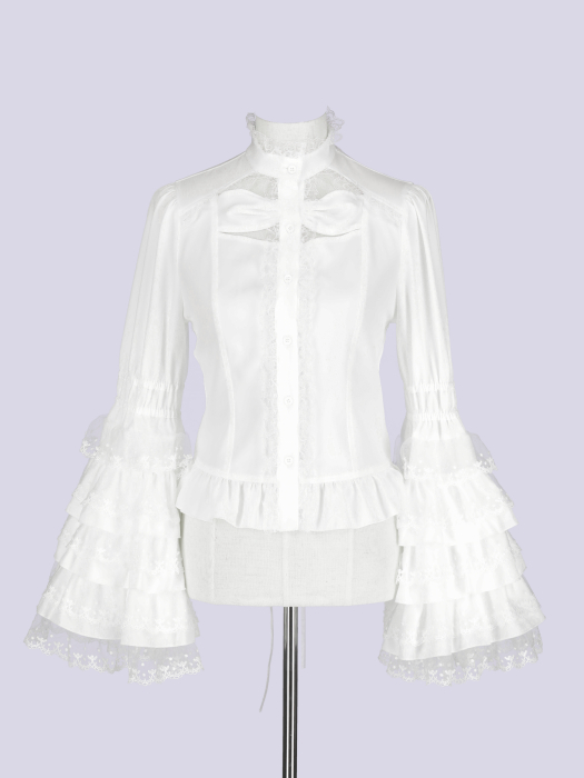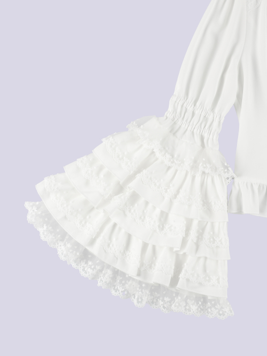 多段レースを贅沢に重ねたボリュームスリーブが主役の姫袖ブラウス。