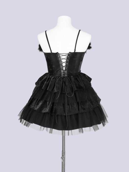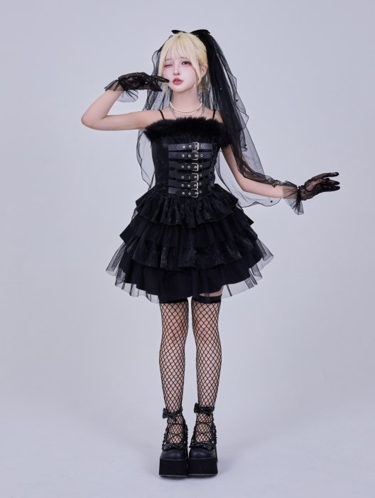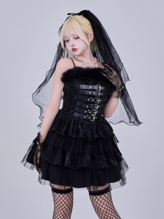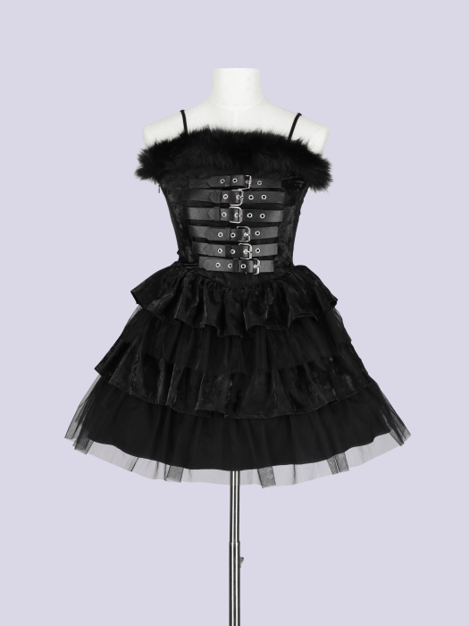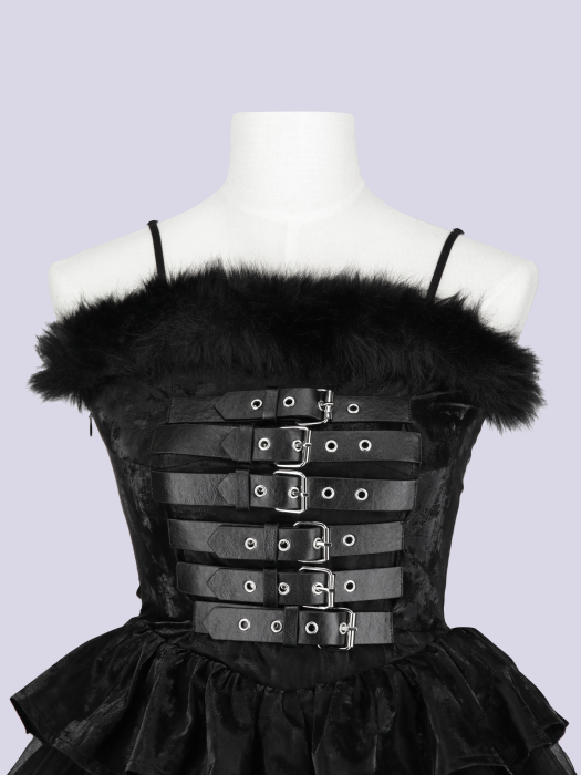 胸元にあしらったファーと、フロントに並ぶ多段ベルトが印象的なBelt Dress。