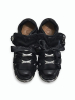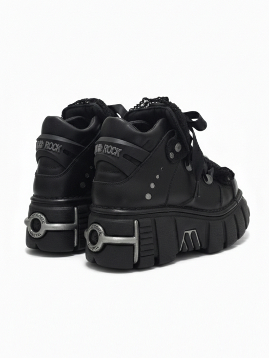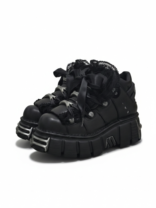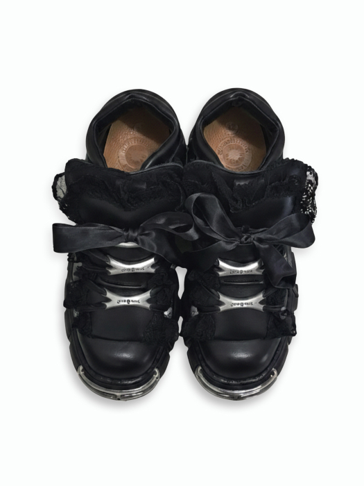 アイコニックな重厚ソールとメタルパーツをベースに、アッパーには2層構造のブラックレースを贅沢に使用。